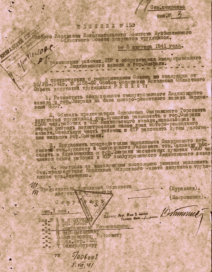 Решение Особого заседания Исполнительного Комитета Куйбышевского Областного Совета депутатов трудящихся "О размещении рабочих, ИТР и оборудования эвакуированного Людиновского завода в гор. Сызрани" от 5.08.1941 г.